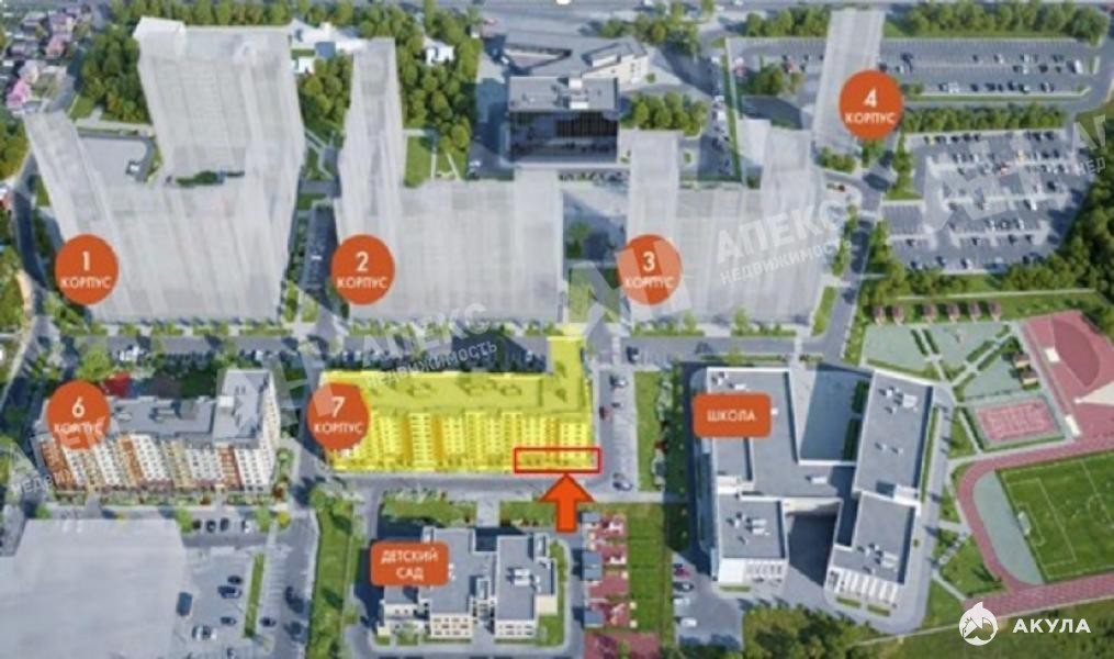 Помещение угловое, имеет прекрасную визуализацию, находится в непосредственной близости к детскому саду (240 мест), а также школе (500 мест). Данное соседство обеспечивает целевую аудиторию для мед. учреждения, детского центра, бассейна и др. направлений. Все дома комплекса введены в эксплуатацию, большинство корпусов заселены на 90%.