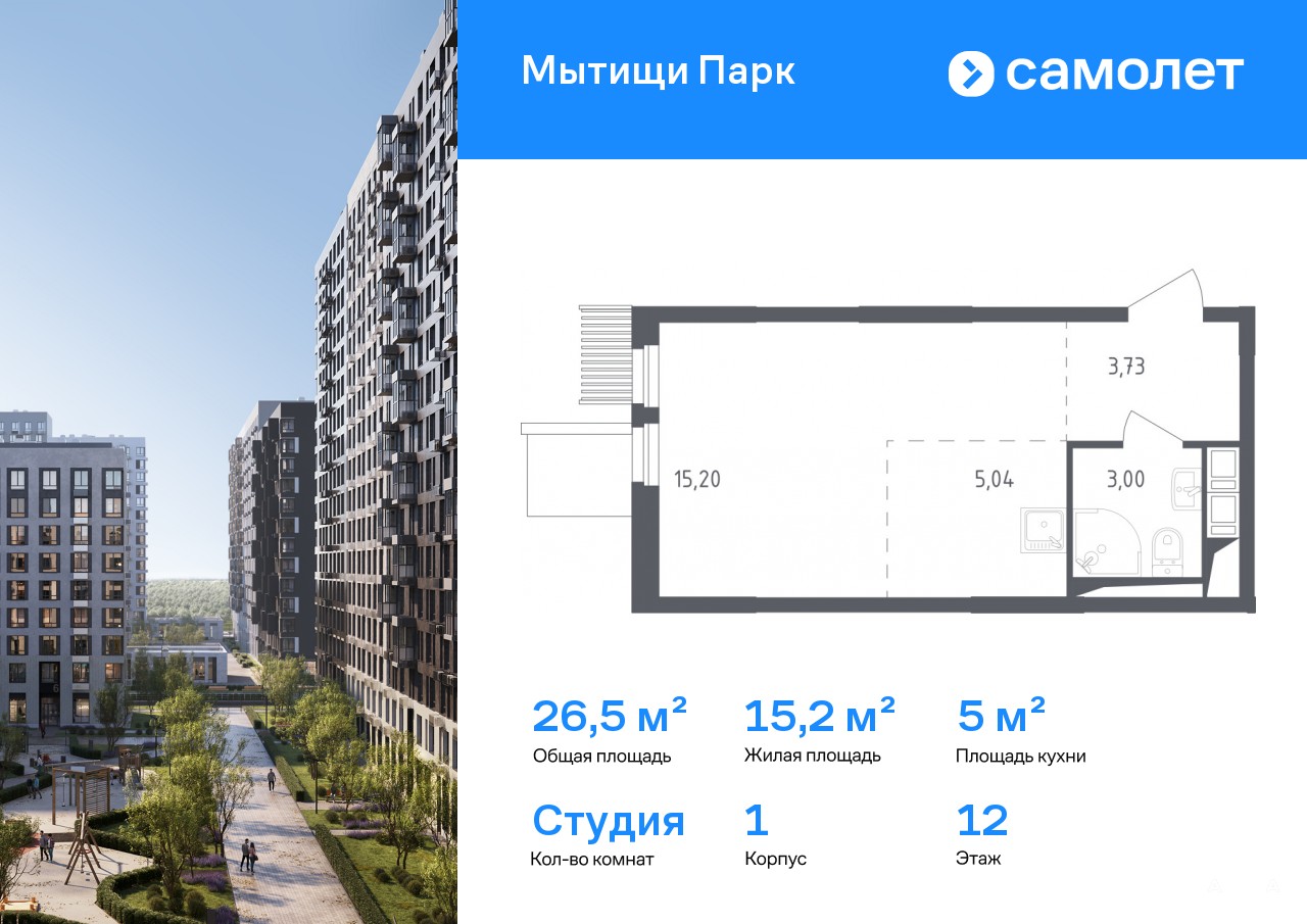 Строим кварталы для жизни с заботой о будущем. Предлагается квартира студия комфорт-класса 26, 5 кв.м в корпусе 1 на 12 этаже, в ЖК «Мытищи Парк»
