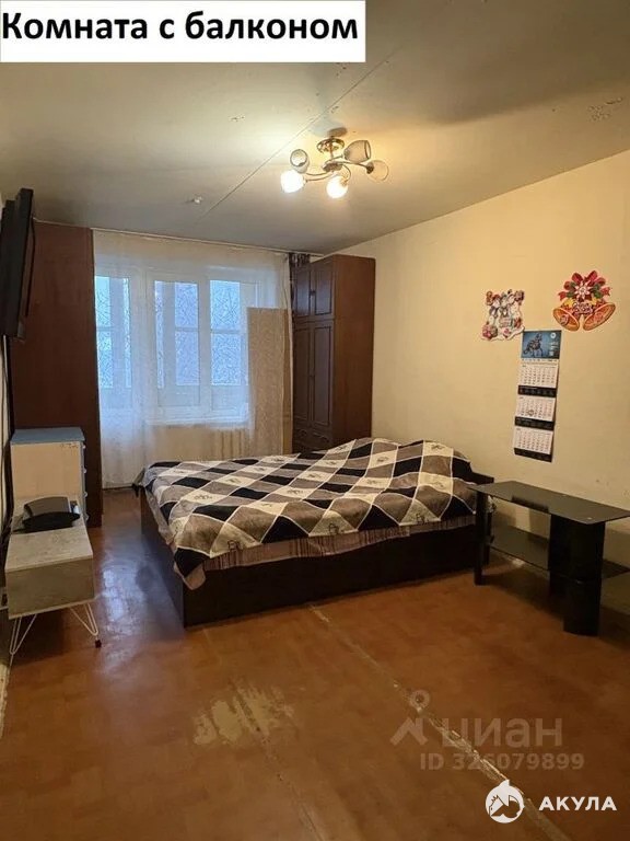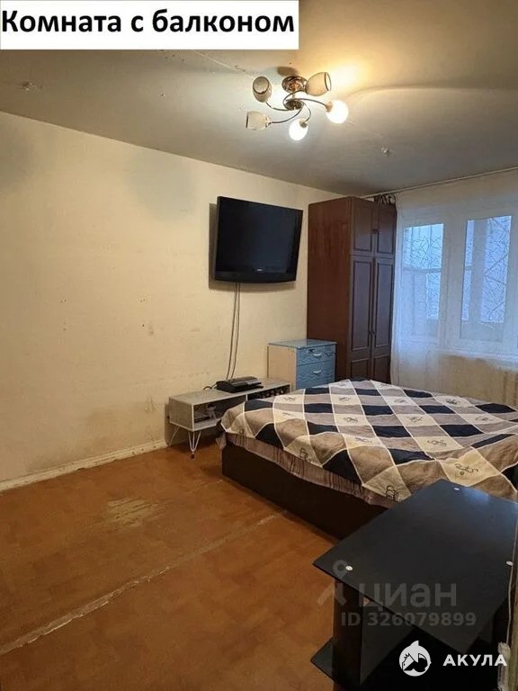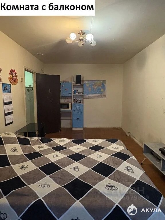 В комнате балкон, кровать, два шкафа, полки, тумба, телевизор. На кухне кухонный гарнитур, плита газовая, холодильник, стол, стул. В ванной стиральная машинка, зеркало, полки. В коридоре холодильник, комод.