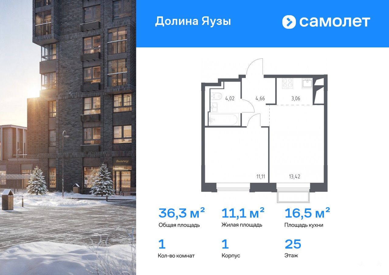 Строим кварталы для жизни с заботой о будущем. Предлагается 1-комнатная квартира комфорт-класса 36, 3 кв.м в корпусе 1 на 25 этаже, в ЖК «Долина Яузы»