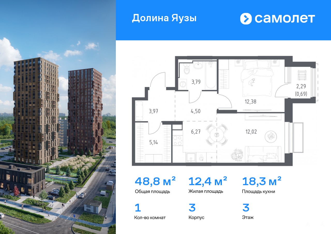 Строим кварталы для жизни с заботой о будущем. Предлагается 1-комнатная квартира комфорт-класса 48, 76 кв.м в корпусе 3 на 3 этаже, в ЖК «Долина Яузы»