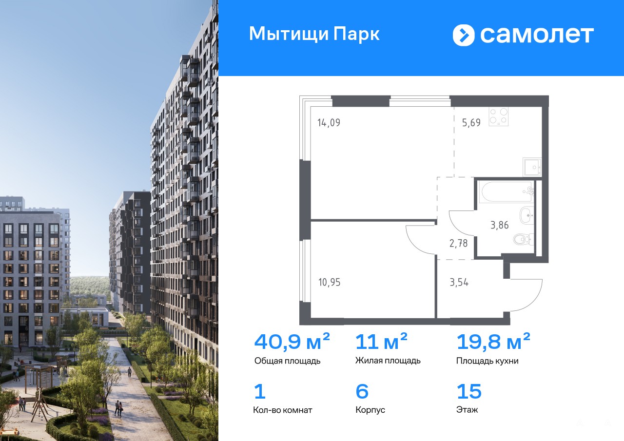 Строим кварталы для жизни с заботой о будущем. Предлагается 1-комнатная квартира комфорт-класса 40, 91 кв.м в корпусе 6 на 15 этаже, в ЖК «Мытищи Парк»