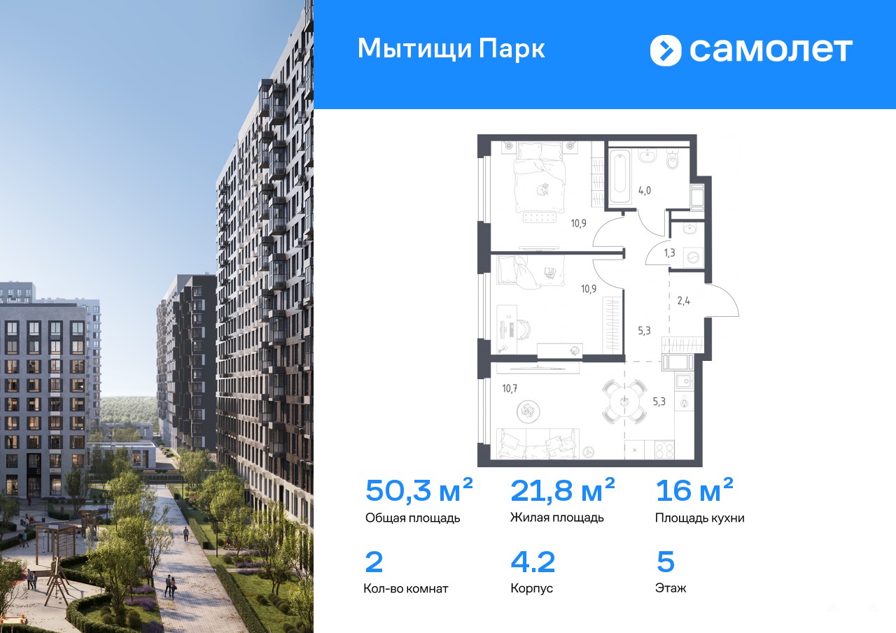 Строим кварталы для жизни с заботой о будущем. Предлагается 2-комнатная квартира комфорт-класса 50, 3 кв.м в корпусе 4.2 на 5 этаже, в ЖК «Мытищи Парк»