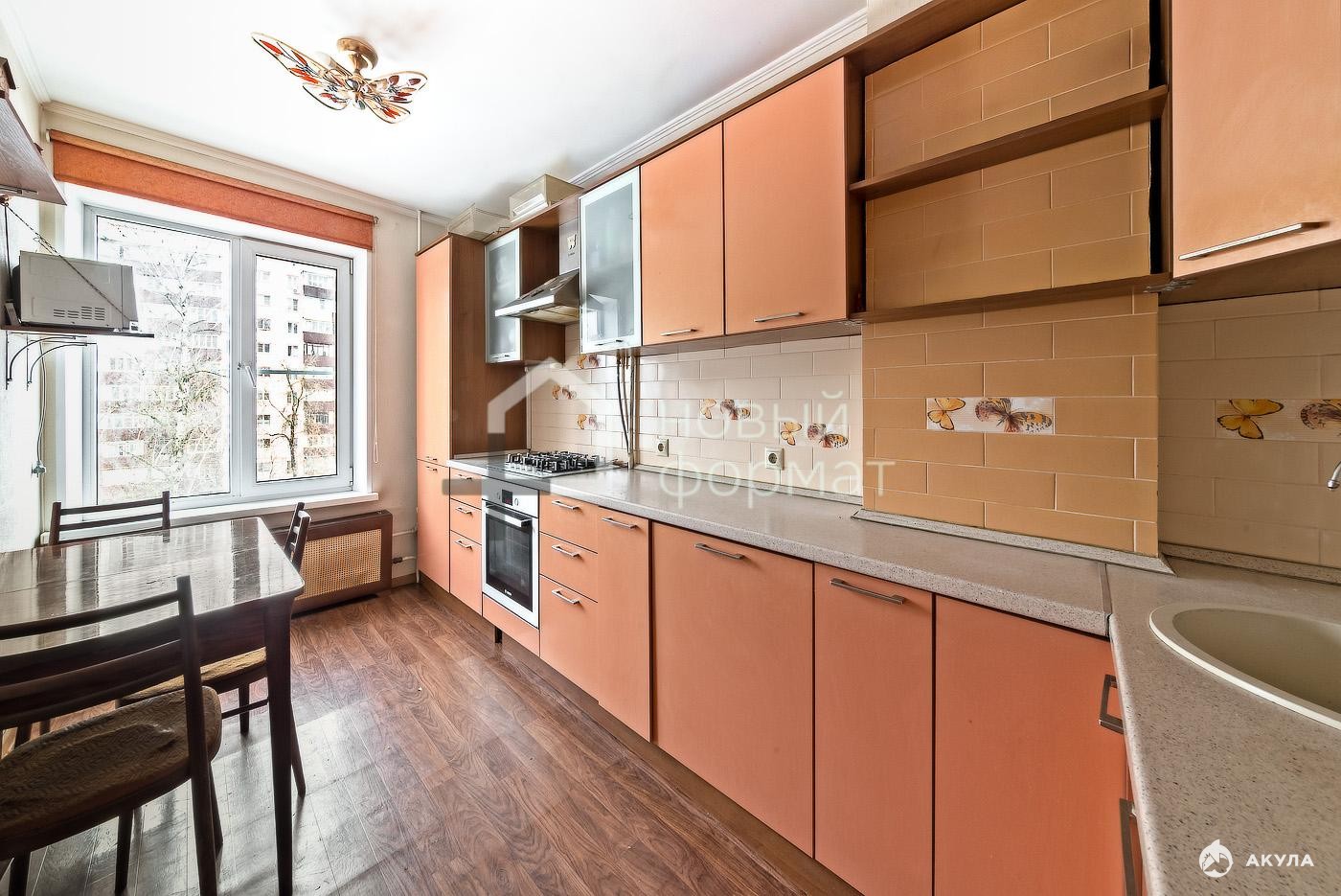 Просторная кухня 11 кв.м., встроенный кухонный гарнитур со всей бытовой техникой(холодильник, плита, духовой шкаф, вытяжка, посудомоечная и стиральная машина) . Теплый пол.
