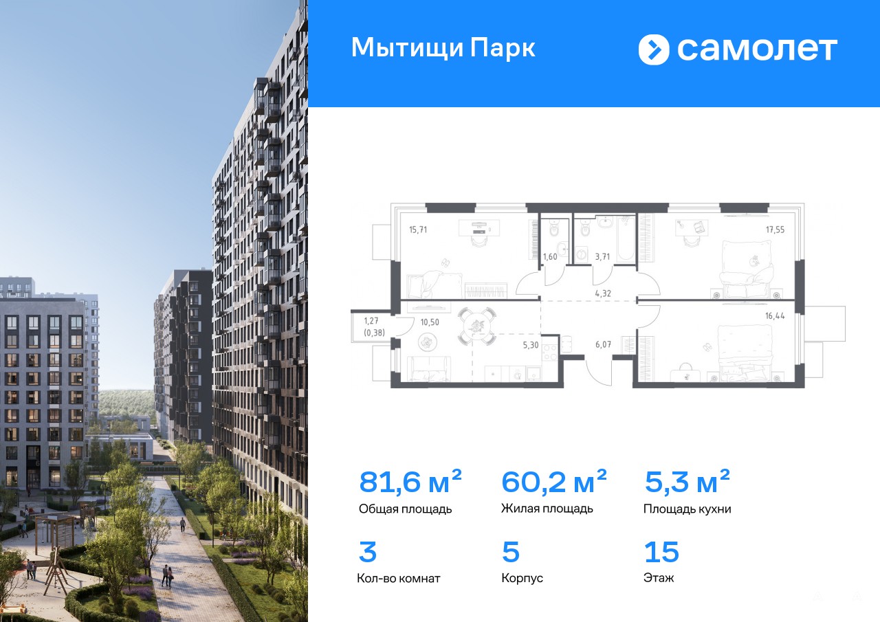 Строим кварталы для жизни с заботой о будущем. Предлагается 3-комнатная квартира комфорт-класса 81, 58 кв.м в корпусе 5 на 15 этаже, в ЖК «Мытищи Парк»