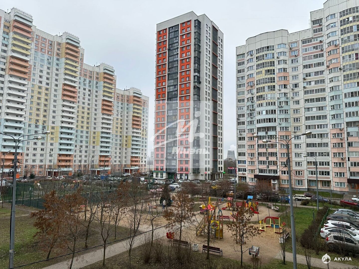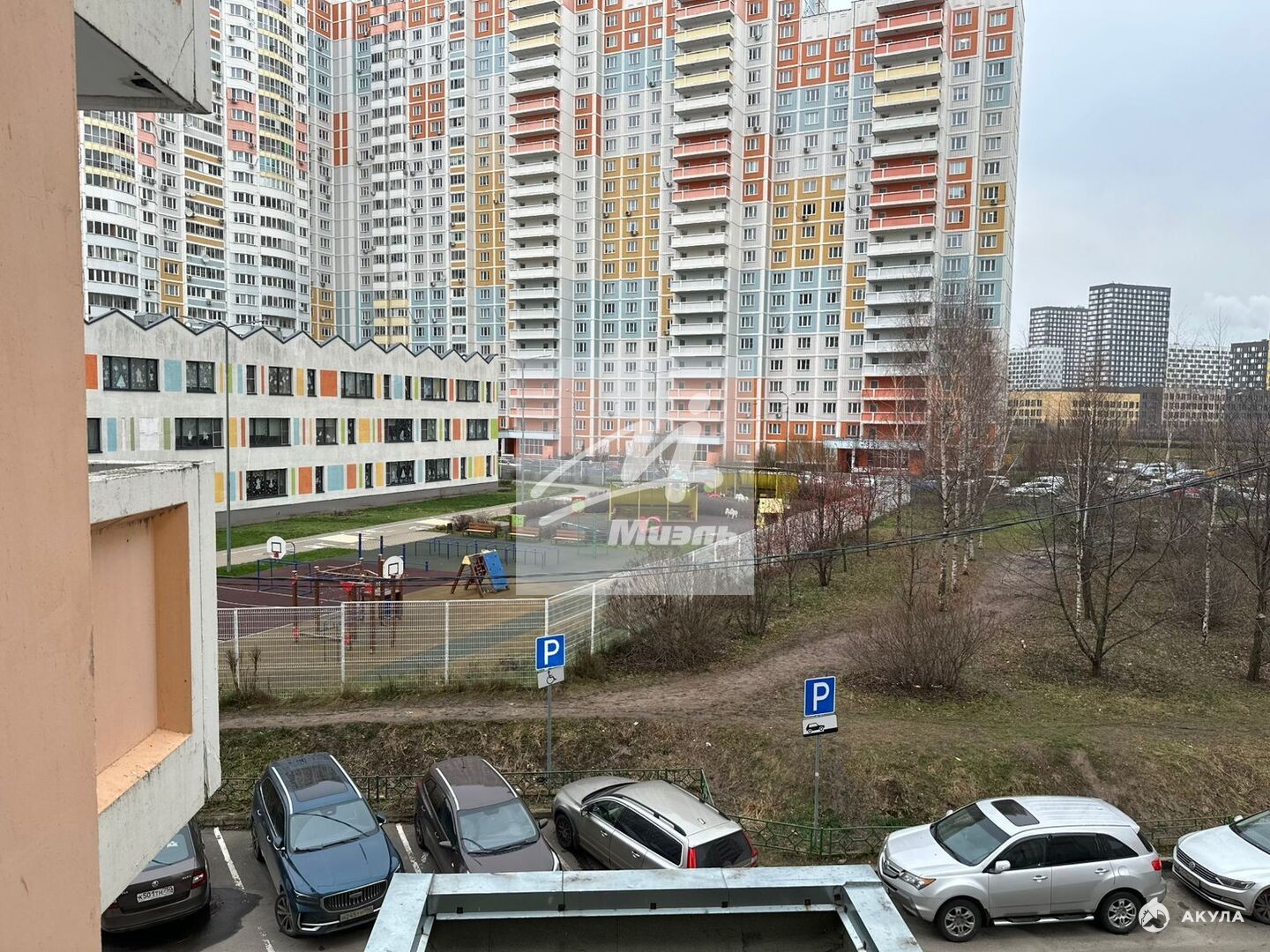 Двор с множеством детских и игровых площадок, большое количество парковочных мест.