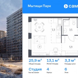 Строим кварталы для жизни с заботой о будущем. Предлагается квартира студия комфорт-класса 25, 9 кв.м в корпусе 4 на 6 этаже, в ЖК «Мытищи Парк» Квартира с чистовой отделкой. Доступность дополнительных опций уточняйте у застройщика. Приобрести квартиру возможно по...