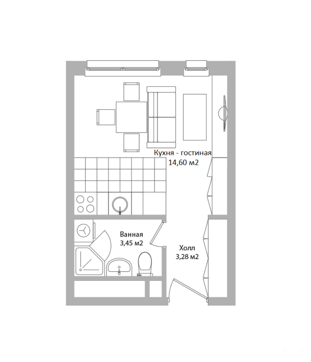 Общая площадь: 21.3 м2. Стоимость указана с отделкой под ключ и с меблировкой. Пример на фото.